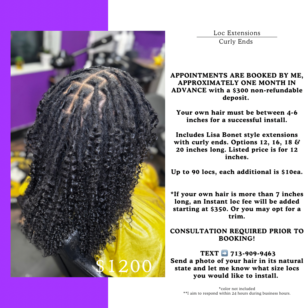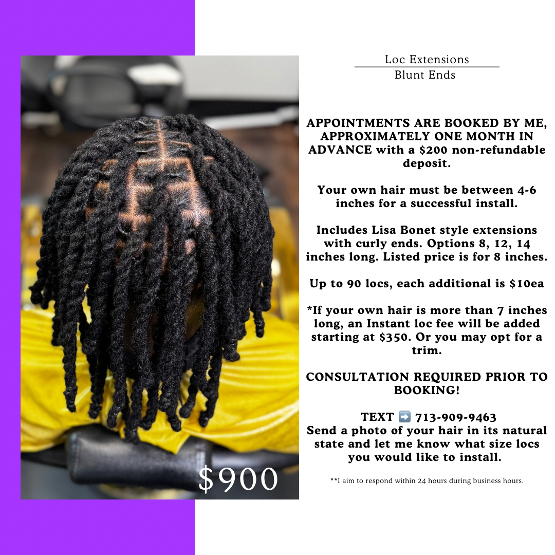 - I offer Install Only services (you provide extensions) starting at $700, Curly End Extensions (hair included) starting at $1200, Blunt End Extensions starting at $900. To get a better idea of pricing, click the BOOK NOW button above. Appointments are typically available one month in advance. For serious inquiries, text a photo of your hair in its natural state as well as an inspiration photo depicting the length and size you desire to 713-909-9463. Deposits (up to $300) are required and non-refundable after 48 hours of booking.
