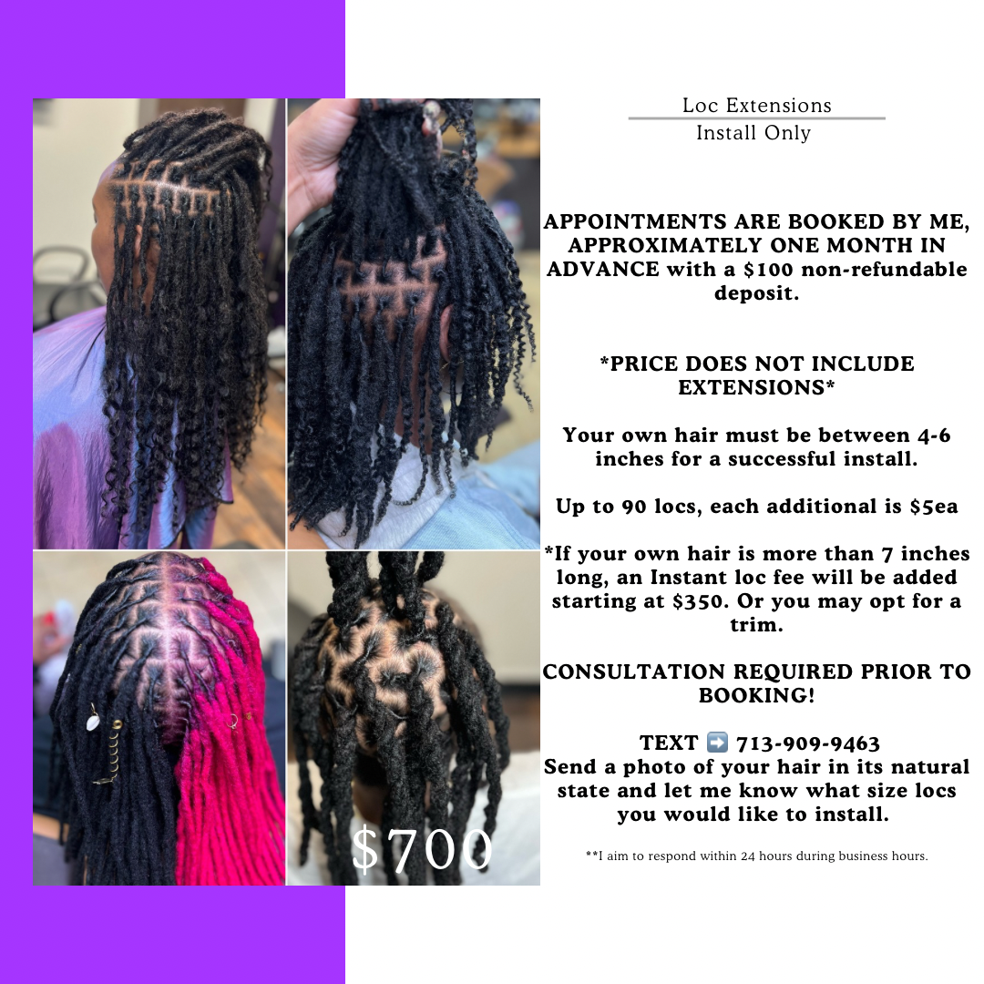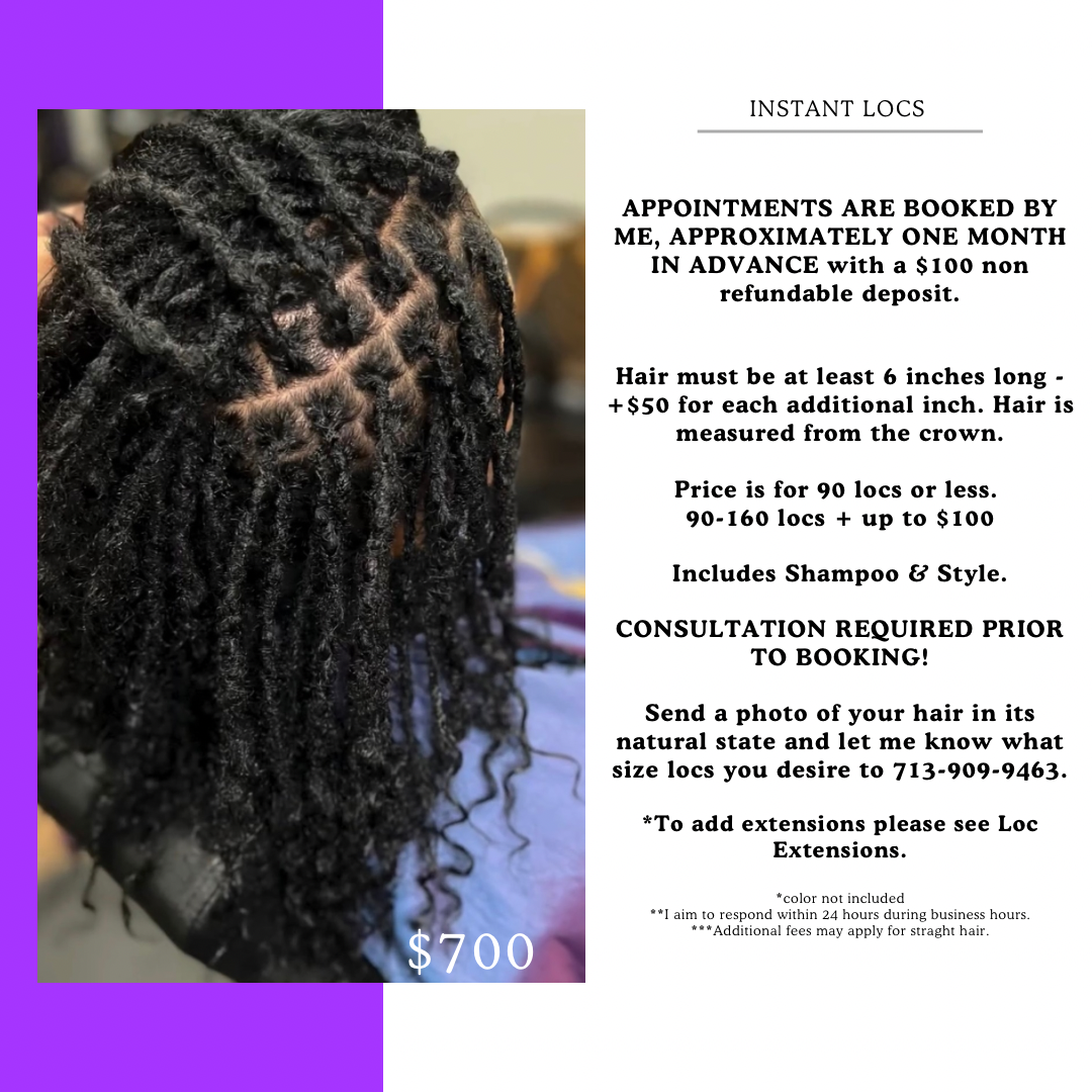 - I provide Instant Loc services and Loc Extensions services as loc starters. The comb coil, traditional, starter loc service is available depending on request. Please text me for consult.